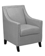 The perfect way to compliment any room with comfort and elegance. Featuring a modern and contemporary design, use this chair as an accent piece in any living or bedroom. Grey linen fabric with individual silver nail heads.