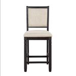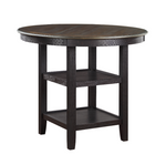 The transitional style of this Counter height Table Set creates a versatile platform to inspire your casual dining room décor. The round counter height table’s support base features a display shelf that allows for quick and open access to your tabletop accessories. The brown and black finish over acacia veneer serves to highlight the wood’s grain while allowing for maximum versatility in decorative accenting. The coordinating wood-framed counter height chairs feature beige fabric seats for complementing contrast.