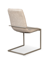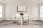 Glamourous style meets modern function with the elegant. An exquisite faux-Carrera marble finish glints underneath the luminous tempered glass of the tabletop, supported by a matching marbled architectural column offset by matte champagne metal struts. The matching chairs are equally unique: a metal frame in a striking champagne finish wraps around to create a contemporary “floating chair” look, while the creamy fabric seats are comfortably padded and supple to the touch. Evoking the grandeur of Art Deco elegance with modern sensibilities, this Modern dining collection is an eye-catching addition to your dining room.