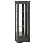 Tier shelving for ample storage/display space. Tempered glass shelves. Storage drawer on Bottom and Light On Top