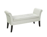 Add refinement and sophistication to your office, entryway or living space with this tailored storage bench. Tufted accents, beveled arms and curved outer framing are wrapped in luxurious faux leather for easy cleaning and very low maintenance. Easily conceal small items using the in-seat storage.