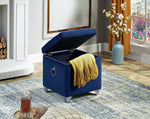 Blue Velvet Storage Ottoman with Deep Tufting, Chrome Ring, Nailhead Details and Chrome Legs