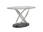 Add instant sophistication to your living space with this glass-topped console table. This table aesthetic fits seamlessly into any space and can be easily included in a living room, den, or family room. Place it in your favorite entertaining room to be conveniently used to hold drinks or appetizers, or use it to display treasured collectibles in a delicate setting. No finishing detail is overlooked to enhance your overall décor. The tempered-glass top is gorgeously beveled and appears to hover over a brushed-chrome stand that features dual, intersecting ovals and the sculpted shapes are then mounted on a sleek, black-painted base.