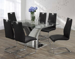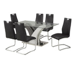 This 7 Pcs dining set features six high-back, rocking chairs with handles on the top and cushioned seating and a tempered glass tabletop supported by eye-catching curved double pedestals in popular contrasting colors, ensuring your family and guests an enjoyable and comfortable dining experience.