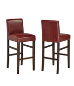 Enjoy the luxuriously soft seat padding wrapped in durable faux leather that is easy to clean. This set of two bar stools comes in three rich and trendy colors to choose from. Perfect for your breakfast counter or the basement bar, these bar stools sit tall and strong with the support of wooden legs that were built with quality craftsmanship. A horizontal bar gives your feet to a place to rest while you indulge and entertain.
